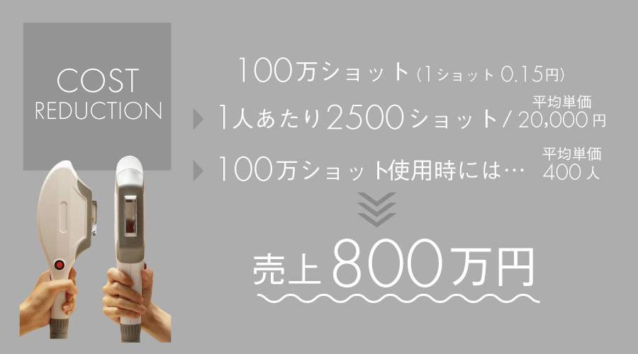 最近は、「コスパが良い」をうたう業務用脱毛機の販売会社が増えてきましたが、どんなに良くても「1ショット0.15円」超える業務用脱毛機はないはずです。